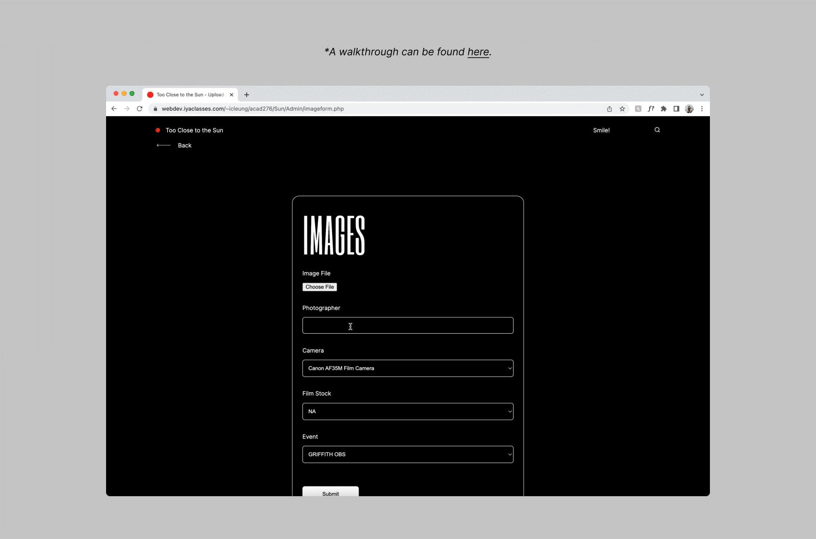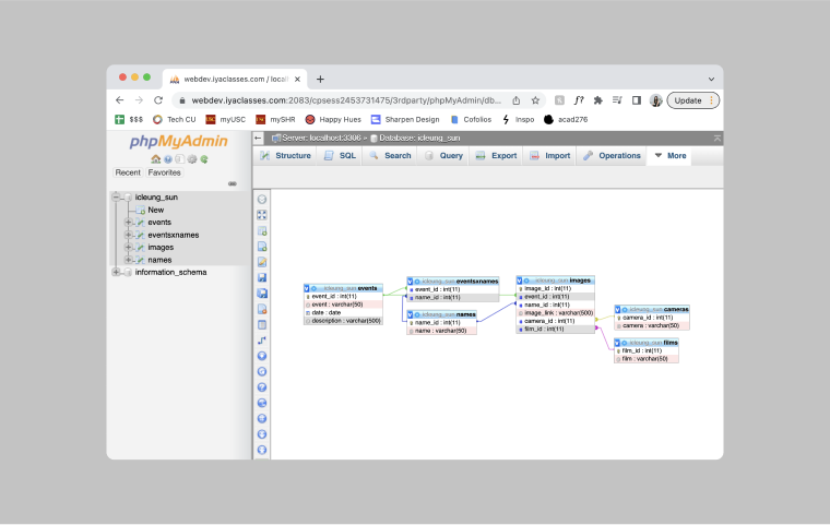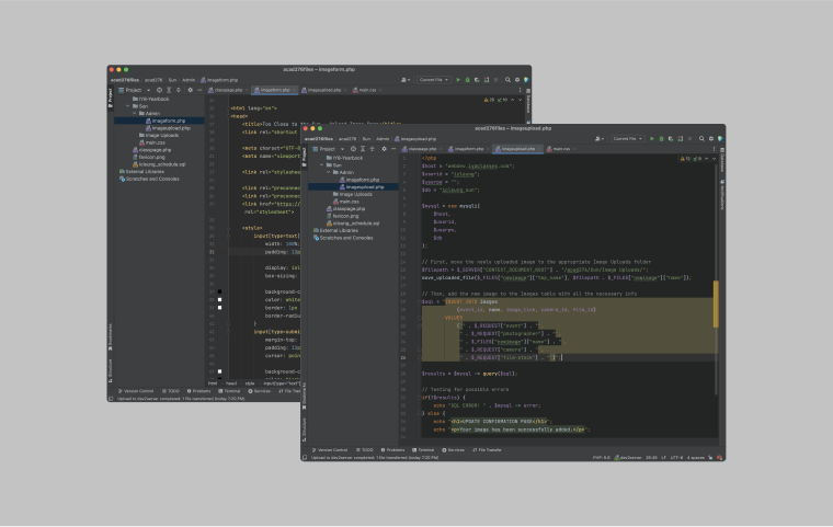 The site was developed entirely in PhpStorm. I flipped back and forth in building the frontend interfaces (in HTML, CSS, and JavaScript) alongside with bits and pieces of the backend (in PHP and SQL).