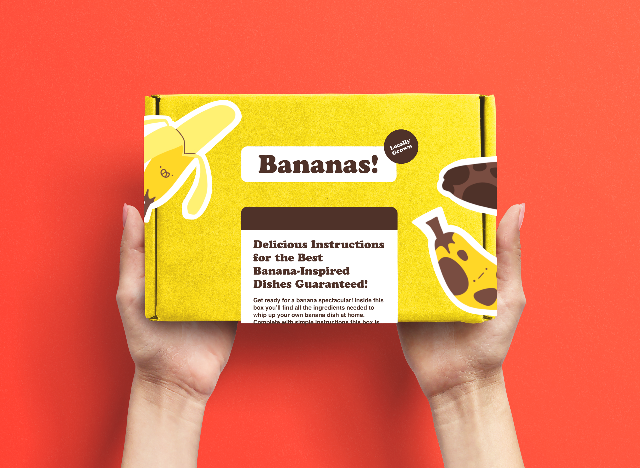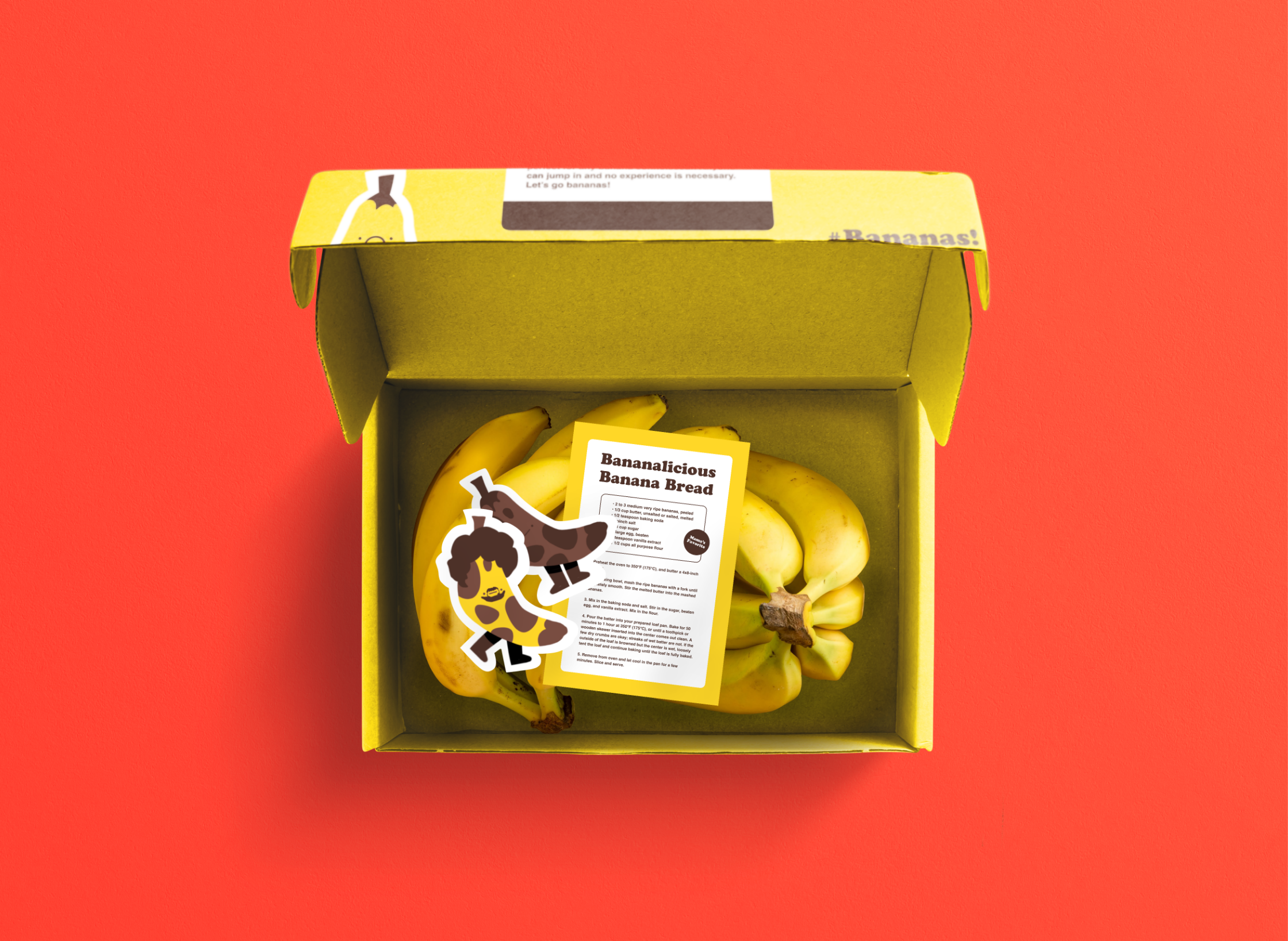 Bananas! is a fictional subscription service that provides customers with delicious bananas. Like many other recurring subscription services, Banans! delivers a full box of bananas each calendar month. Boxes also contain collectable stickers and a sheet of instructions for a quick at-home cooking project. These banana-inspired instructions, of course, are simple to follow and perfect for any banana connoisseur. Anyone can jump in and no cooking experience is necessary. Let’s go bananas!