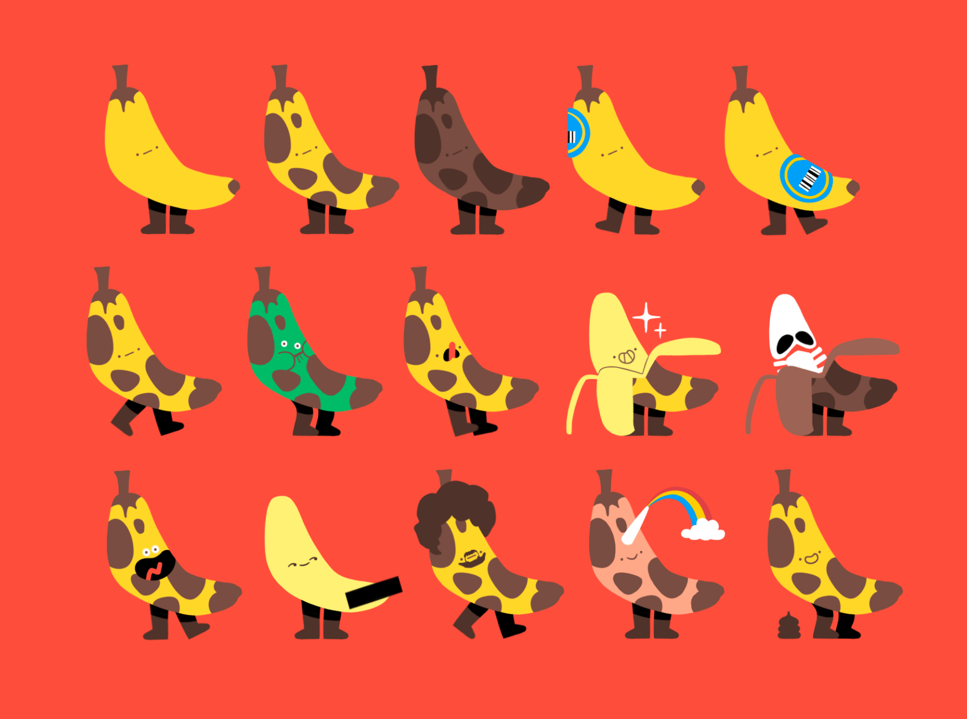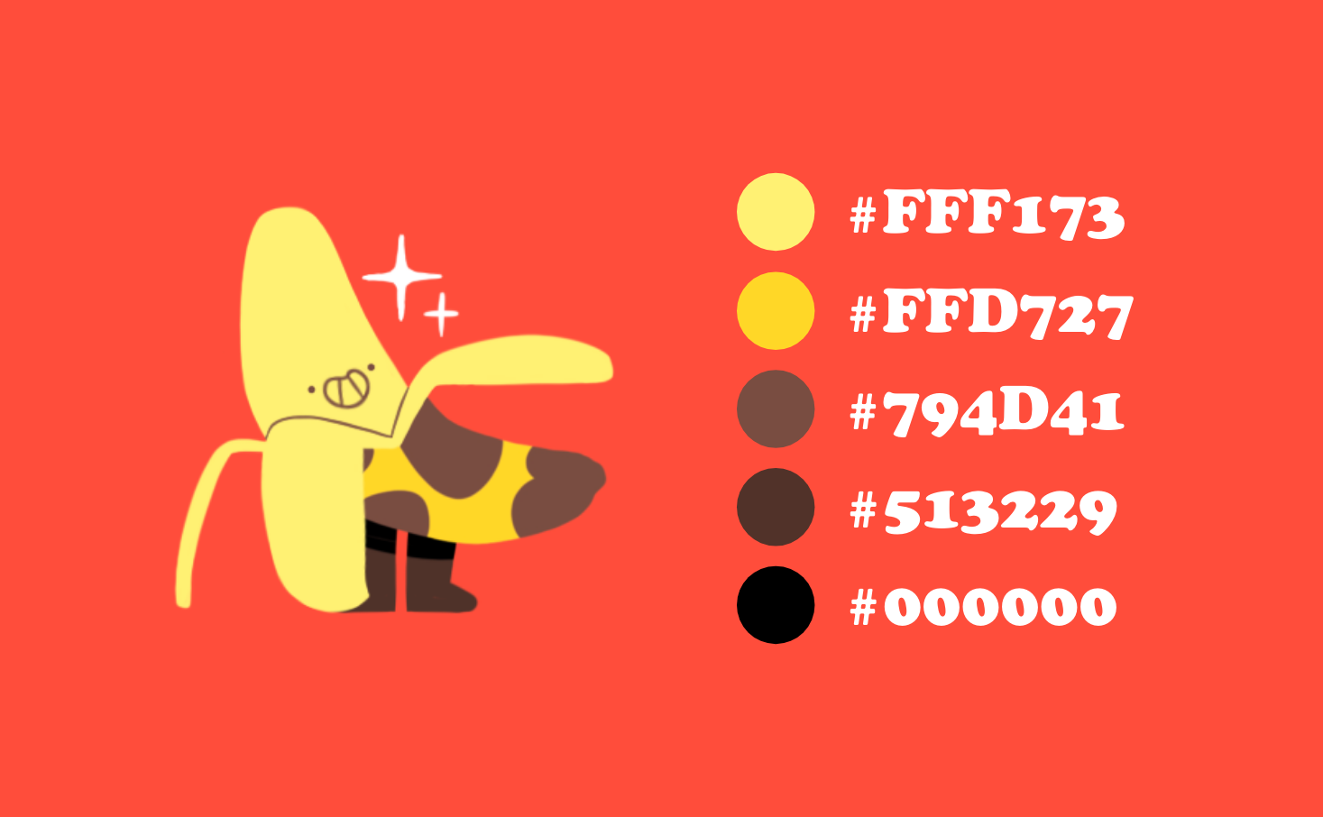 I started this project by illustrating several different bananas, fitting each with different expressions, costumes, and movements while still keeping the color palette homogenous. Initial sketches were scanned and further developed to colored illustrations through Procreate. The overall color scheme and finalized characters are included below.